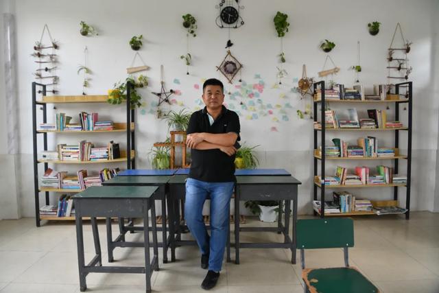 詹大年按照自己的理想中的学校重新设计,教学楼一层的走廊加宽,外立面的窗户全部由玻璃改成了密密麻麻的木材,孩子们可以在木材上随意钉上自己的作品。走廊里到处都是木质的书架,可以放书,也可以放上工艺品。原来的两间教室被打通成一间,前半部分是传统的课堂,后半部被书架做成的玄关隔开,改造成休闲书吧、茶水吧,孩子们可以在这里看书、休息。