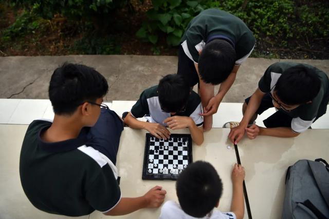 上午的军训课因天气炎热取消。孩子们凑在一起,在小花园下起了国际象棋。摄影/刘冉阳