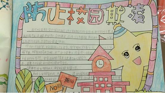 活动前,各班班主任布置学生围绕主题创作一份手抄报。学生通过自己动手和小伙伴协作等方式完成手抄报的创编。经过精心评选,学校少先队大队部评出版面新颖、内容丰富的优秀作品将结集成册。校园暴力带给我们的不仅仅是身体上的伤害,更会给受到欺负的同学的心灵上造成深深的伤痕,更是会影响我们的学习,校园应该是每一个学生健康成长的地方,我们应该积极反对校园暴力,让我们的校园更加的和谐,让每一位同学都可以健康快乐的成长。