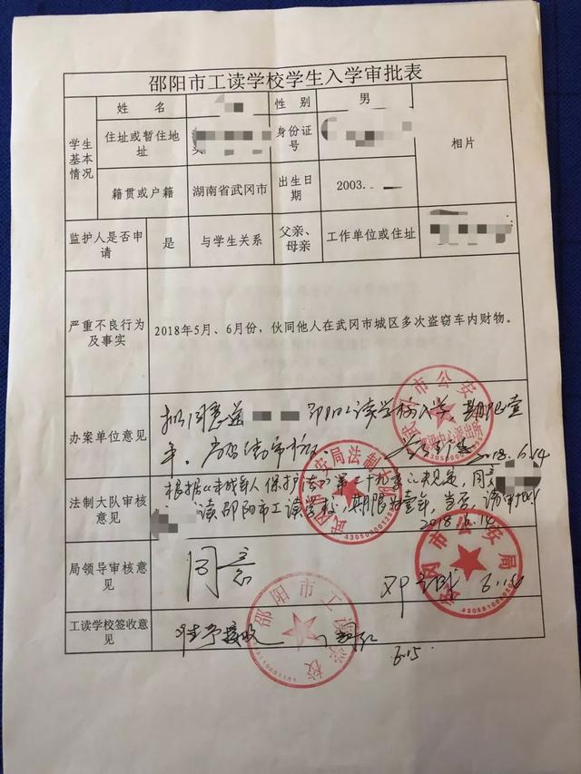 申请表是警方和学校的交接程序。上面记录着孩子的基本信息、违法事实,经过监护人及公安机关办案民警、法制部门负责人、局领导层层签字后,被交到邵阳市工读学校副校长周红手中。