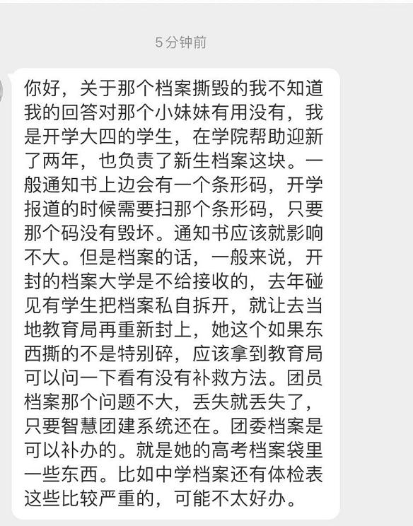 事情发生之后,学生去联系老师,老师也表示很无奈,我们在图片上能够清晰地看到,录取通知书被撕毁,然而档案也被破坏,这真的是想要毁了自己女儿的前途,这真的是实实在在的坑娃吧!