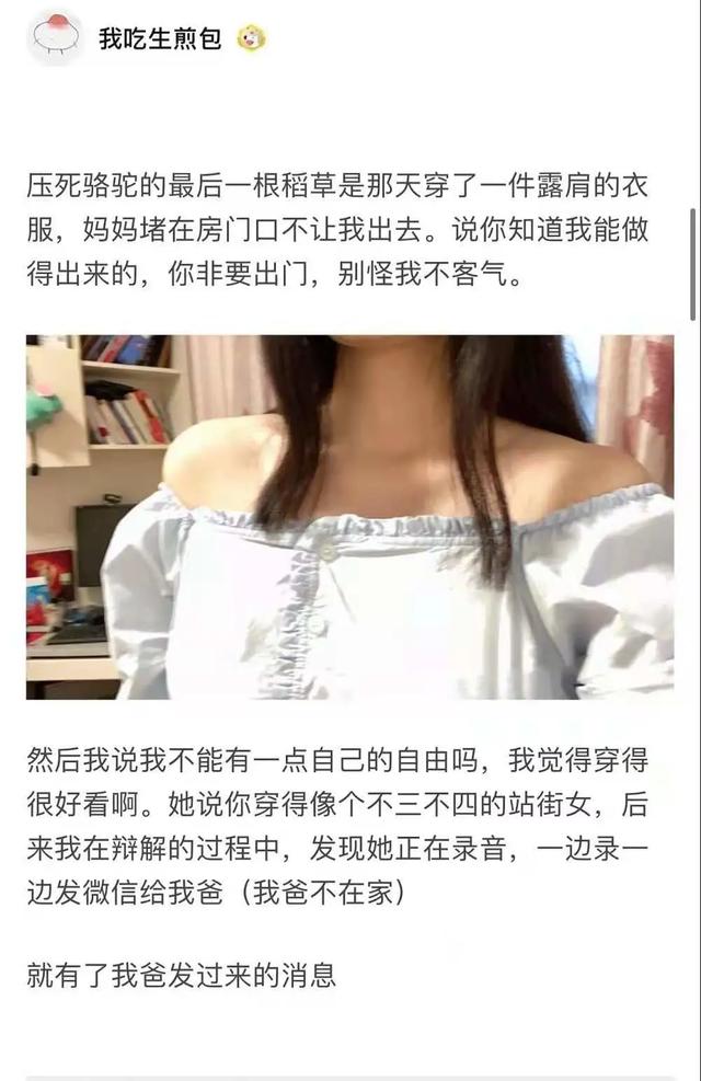 一个成年女性,不仅连穿衣打扮的权利都没有,还要遭到侮辱攻击,而且这些羞辱竟然出自最爱的父母之口,女儿的心里该有多么痛苦,多么失望!