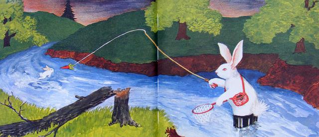 绘本中,小兔子思绪上蹿下跳,一会儿是鳟鱼,一会儿是空中飞人,跳动空间真可谓“无穷无尽”,任凭兔子妈妈在后面追赶。