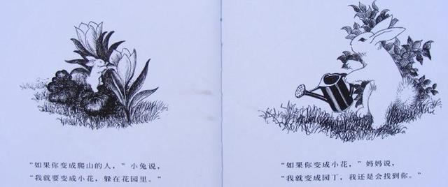 小兔子对妈妈说“我要逃走了”,这并不代表小兔子的淘气或叛逆,而是满世界里寻找“爱”;它脑洞大开,把自己想象成鳟鱼、石头、小花、小鸟等物体,其实就是在没有妈妈的环境里鼓励自己坚强地活下去。
