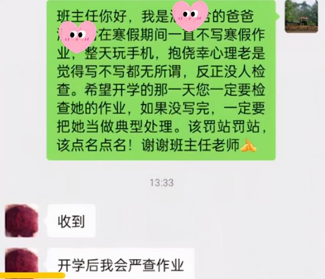 眼瞅着开学在即,一女生就迟迟不肯写寒假作业,真是能拖一天是一天,爸爸也是无可奈何,多次劝说无效之后,只能出绝招了,将女儿对作业的态度和最近的表现都告诉了班主任,还和老师强调要严查她的作业。