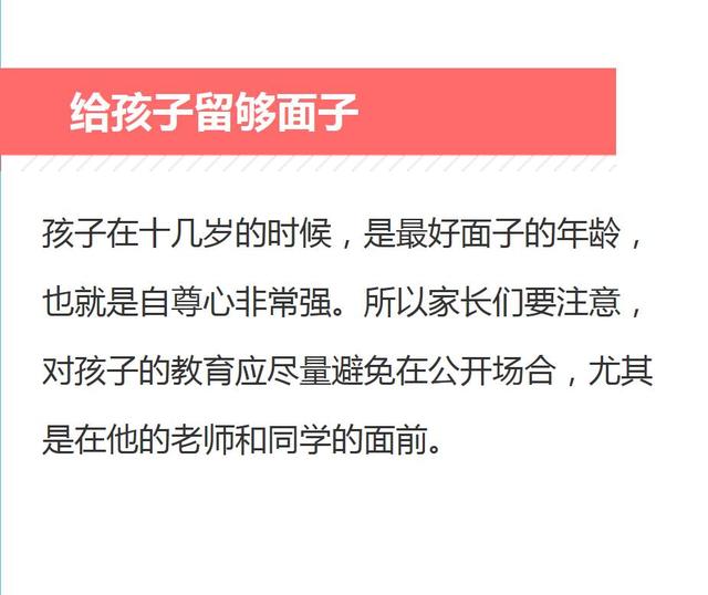 自尊心是一把双刃剑。作为父母,如果还像小学那样,出了问题,对孩子就是一味的申斥,尤其是当着其他人的面,不允许孩子申辩。这样做,非但起不到教育他的效果,反而会引起他对你的排斥和反感。孩子听到你披头盖脸的教育,首先想到的是自己很没有面子,今后怎么还能在同学们面前抬起头来,而不是反省自己到底是不是错了或错在哪里。