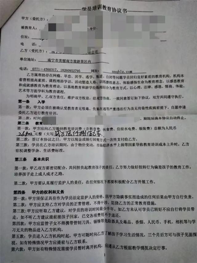 对此类非法办学的矫正机构而言,监护转让权合同是 “规避风险”最有效的手段。据亲历者家长称,在每个未成年学员入学前,群博励志学校都与家长签署《未成年人监护权转移协议》。协议显示,学员在校期间,家长自愿将其全部监护职责委托于群博励志教育咨询公司行使,学习、生活、训练等均有校方安排,并由双方共同承担相应法律后果的民事行为。