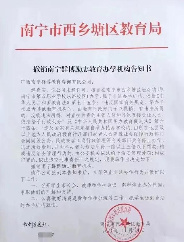 截至2021年11月14日,南宁市西乡塘区教育局再次将群博励志学校查封前,仍有40名学生被困其中。