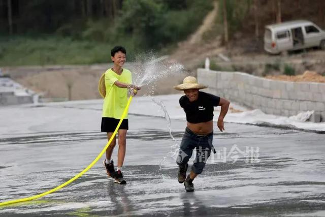 这天乘着给新路面浇水保养车机会,姚仔“偷袭”工友,大家爆发出快活的大笑。