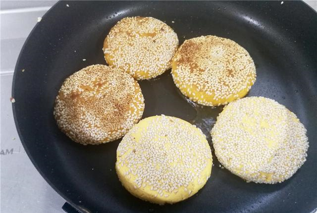 6、平底锅提前预热好,用刷子刷一层食用油,然后放入饼胚,开小火慢煎,等一面煎至定型,变成金黄色,用铲子翻面,继续煎另一面,等两面都煎至金黄后就可以出锅,这道南瓜黑芝麻糯米饼就做好了,吃一口,香甜松软,特别好吃。