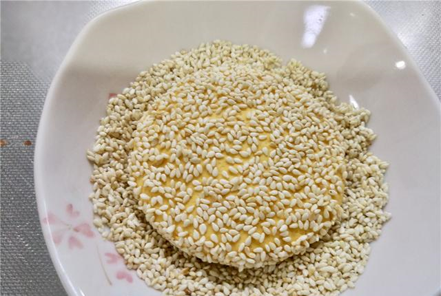 5、盘中放入适量的白芝麻,然后再放入做好的饼胚,使其均匀的裹上一层白芝麻。