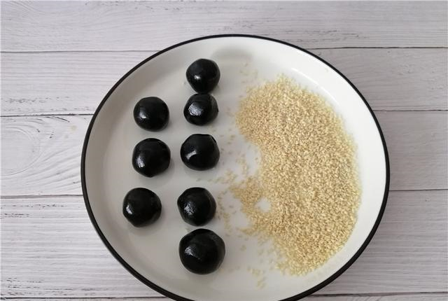 3、取适量的黑芝麻馅,揉成圆球状,我用了100g的黑芝麻馅,分成了10份,一个大概10g左右。黑芝麻馅大家可以去超市买现成的。