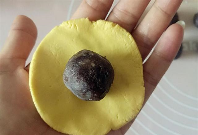 4、取适量的南瓜面团,大概20g左右即可,用手揉成圆球,轻轻地按扁,然后放入一个黑芝麻馅,用虎口向上收口,最后把收口朝下用手轻轻地压成小圆饼。