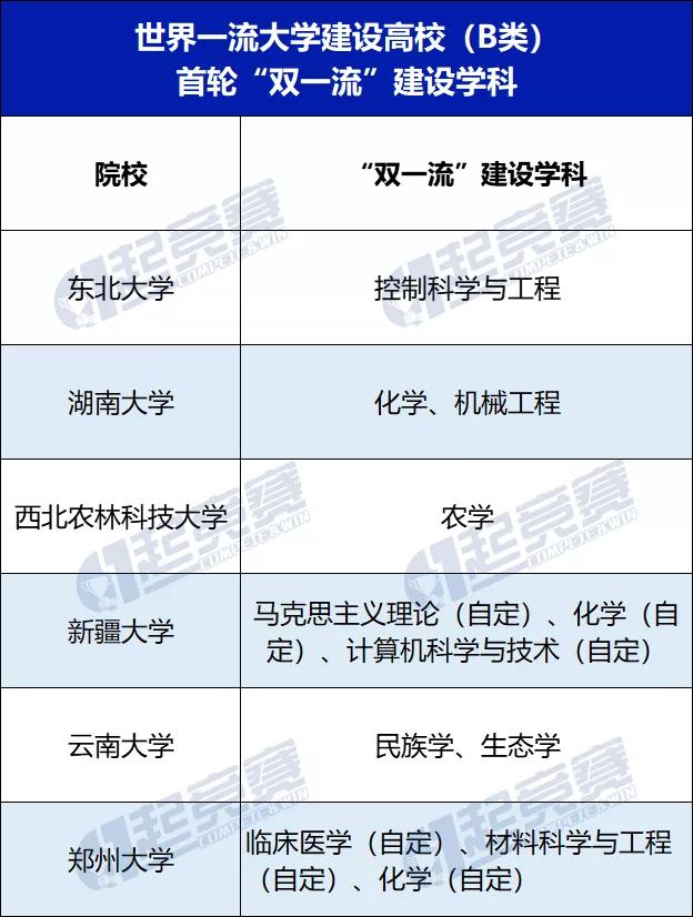 首轮42所双一流高校名单中有6所高校(B类)尤为特殊,它们是东北、湖南、西北农林科技、郑州、新疆和云南。划分A、B类一流对高校有激励作用,第一轮中的B类院校也希望通过学科建设逆袭进入A类”。