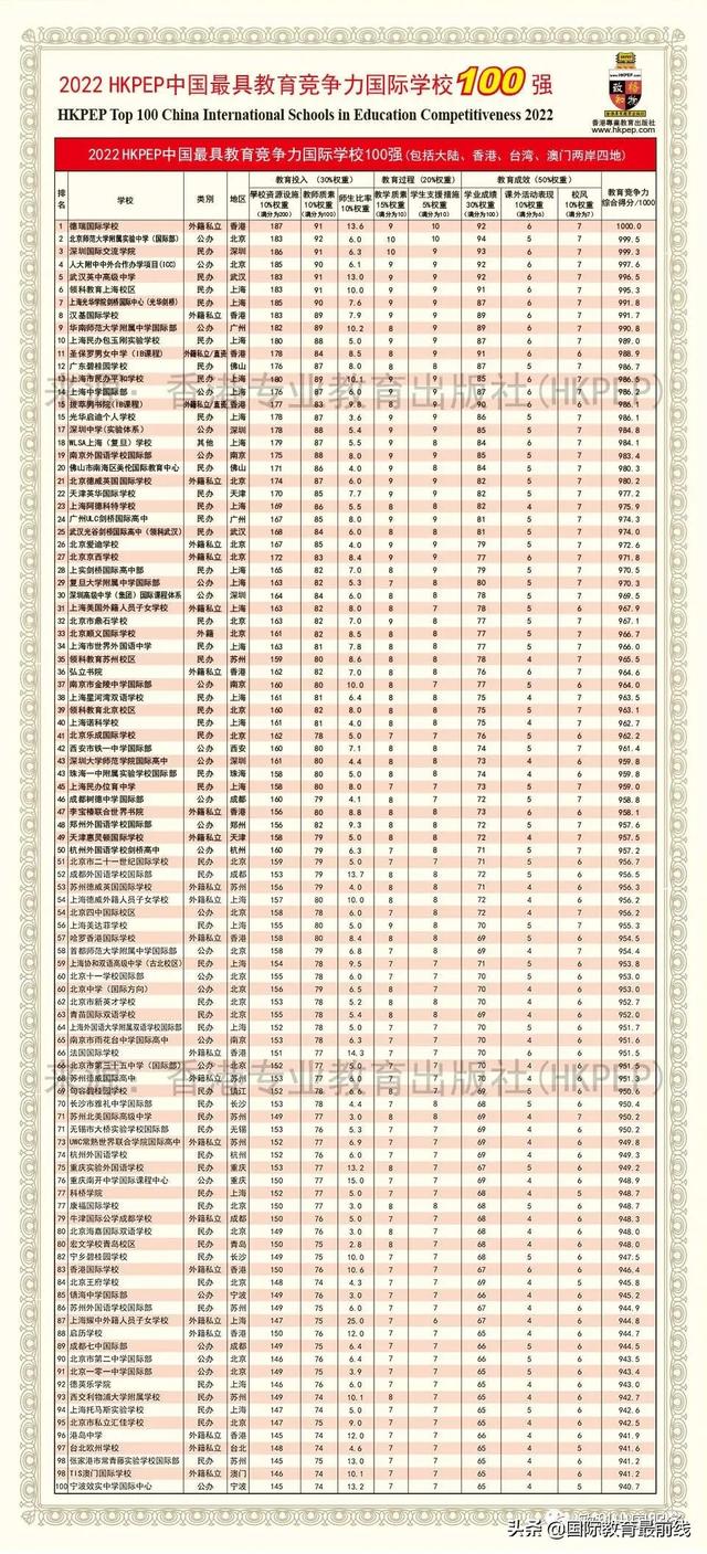 在众多国际学校的权威排名榜单中,由香港专业教育出版社发布的《2022 HKPEP中国最具教育竞争力的国际学校100强》榜单特别的醒目,这个榜单基于联合国教育、科学及文化组织出版的统计年鉴有关国际通用的教育指标,采用“教育投入—教育过程—教育成效”的评比架构,具体衡量国际学校教育竞争力评选体系及其一级、二级、三级共63项教育指标,综合评估了中国两岸四地(内地、香港、澳门、台湾)国际学校的教育竞争力。