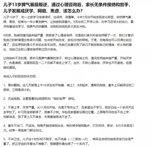 13年的压抑生活,想通过4次的心理咨询就能看到孩子的好转,有些不太现实。意识到教育理念有问题是一回事,能否改变则是另一回事。当你意识到教育理念有问题,你是否清楚有哪些具体的问题?它们是怎么样影响你孩子的?