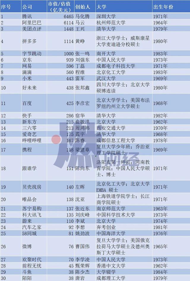 根据市值/估值排名,燃财经整理了30位中国科技互联网大佬当年所上的名单,借此一窥大佬的高考与生涯对他们是什么样的存在。不过,下表仅统计了科技互联网行业上市、未上市企业,且为了避免企业家重复,阿里健康、腾讯音乐、网易有道等巨头旗下企业并未列入。
