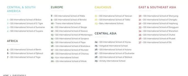 目前QSI教育集团在全球有37所校区,因为最开始创办起源是为了满足一些外交官的需要,以及大型企业人才子女的就读,因此QSI也被称为“外交官子女学校”。