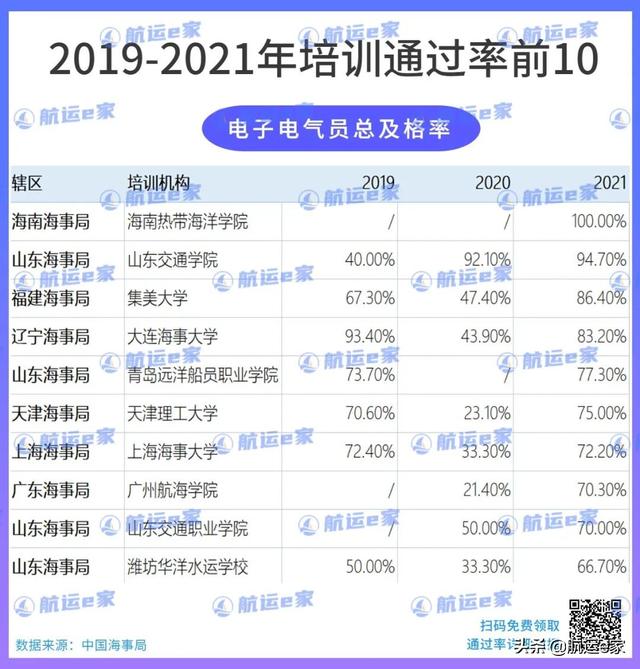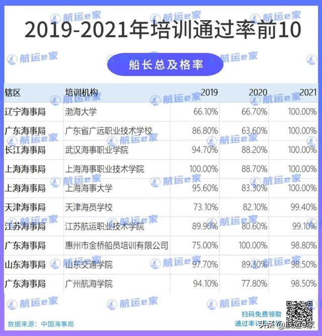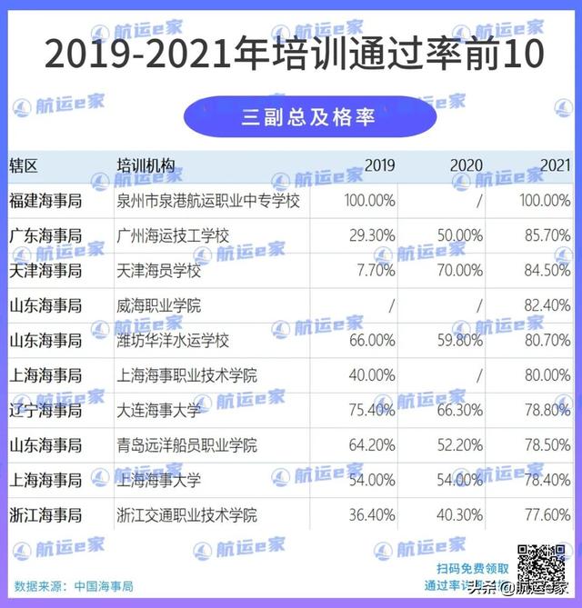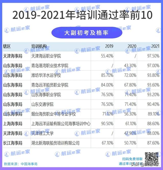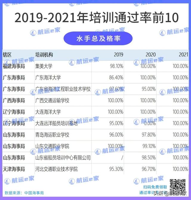 大家可以看到:不管是21年,还是20年、19年,水手的初考及格率和总及格率仍旧非常高,总及格率前十名都是100%。这说明水手不难,好好上课是都可以通过的,所以想要入行的朋友完全可以放心。除了排名前10院校,其他院校在水手培训这块的表现也都很好,大家可以根据自己的喜好选择。
