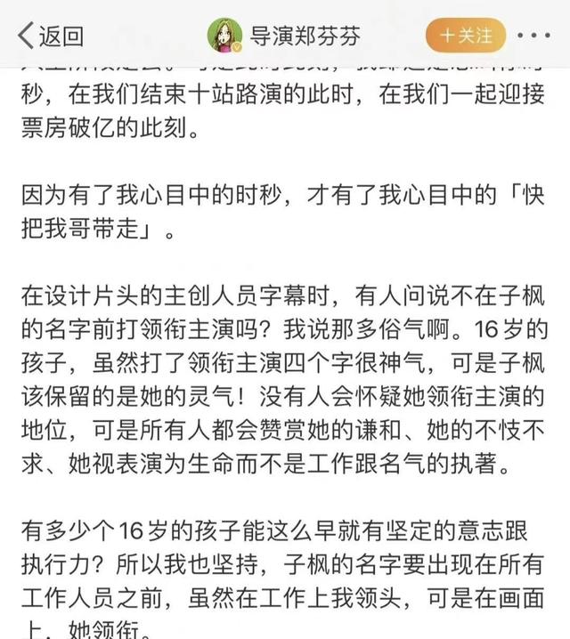 导演郑芬芬也在自己的社交平台上发长文,肯定了张子枫的演技。