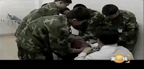 同时,双手被铐在禁闭室的窗栏上,由4名教官轮流看守以及“管教”。